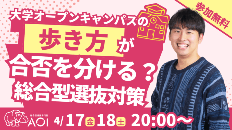 このイベントでは、総合型選抜の仕組みと対策の全体像を1時間で解説します。オープンキャンパスを最大限に活かすための視点も含めて、専門家がお伝えします。