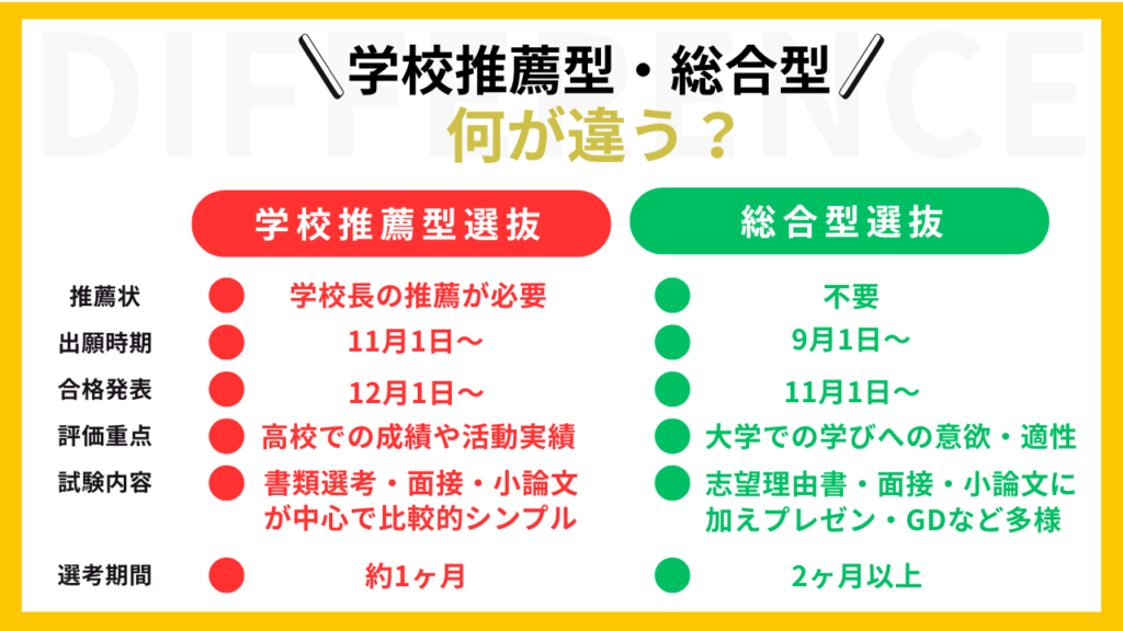 総合型選抜と学校推薦型選抜は、3つの点で明確に異なります。